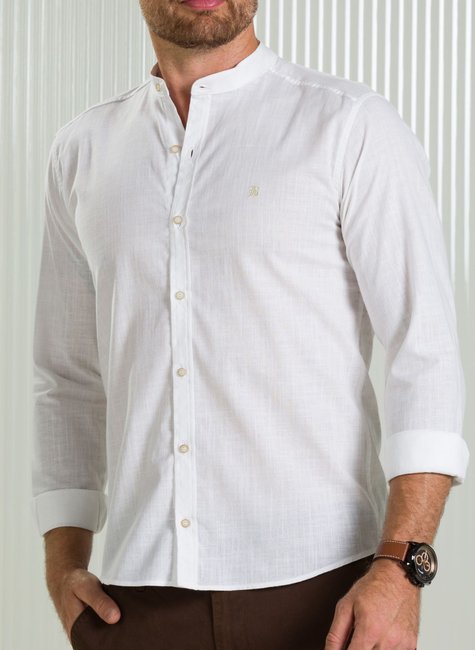 Camisa masculina BGT branca slim com gola padre e punhos entretelados. Tecido leve e respirável, frente costurada com abotoamento total e bordado da marca no lado esquerdo.