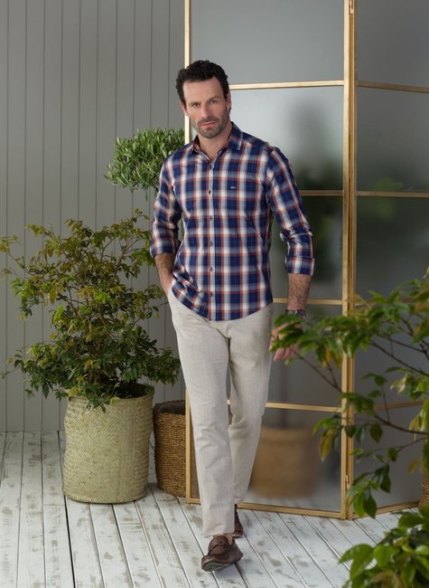 Camisa Masculina Manga Longa BGT Slim Branco com Azul e Laranja