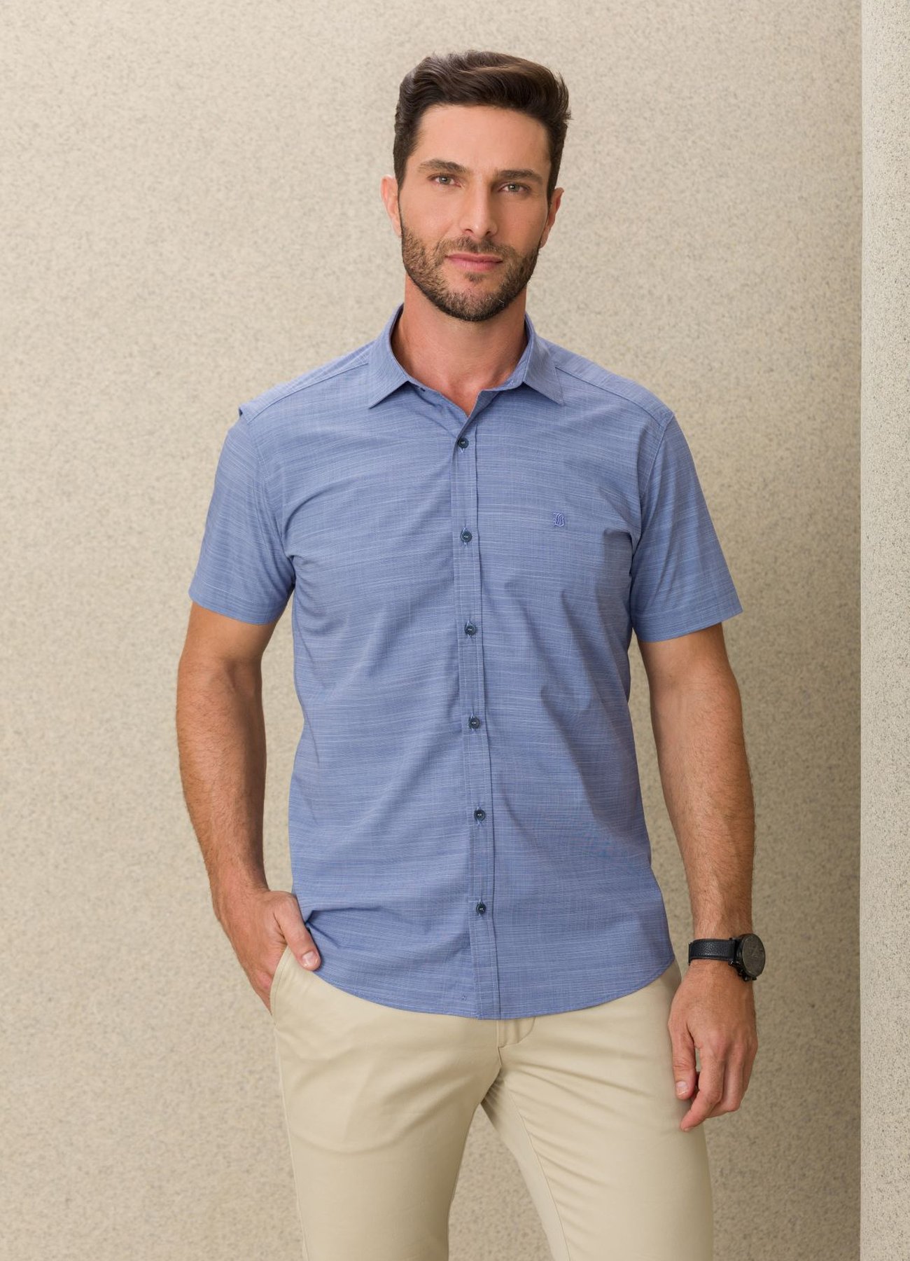 • 1 Camisa Casual Masculina Manga Curta BGT Slim Viscose de Bambu Azul