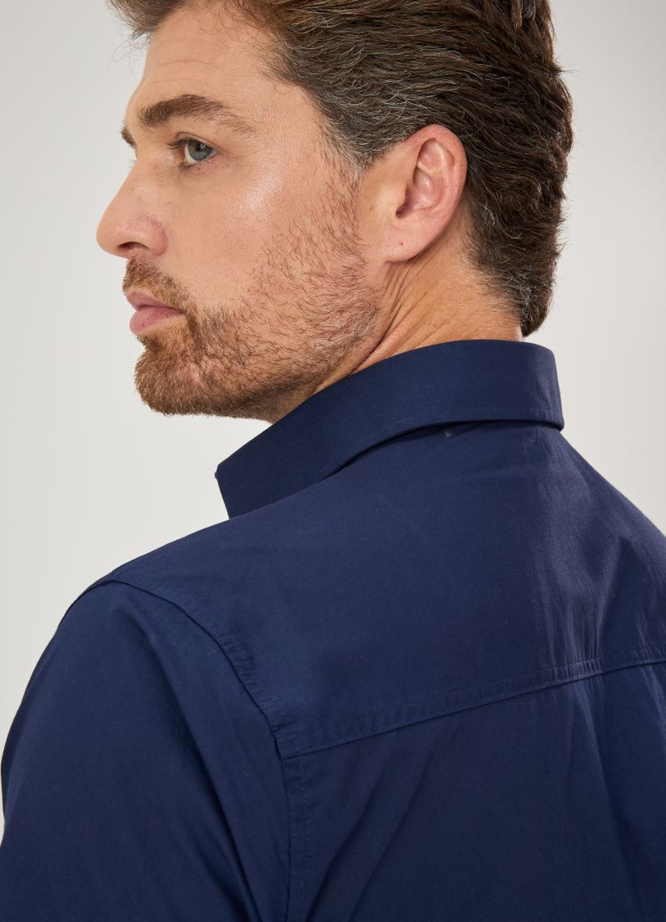 O azul marinho é uma cor atemporal, fácil de combinar com diferentes peças, tornando esta camisa uma opção prática para variados looks, desde combinações com jeans casuais até calças de algodão para ocasiões mais formais.