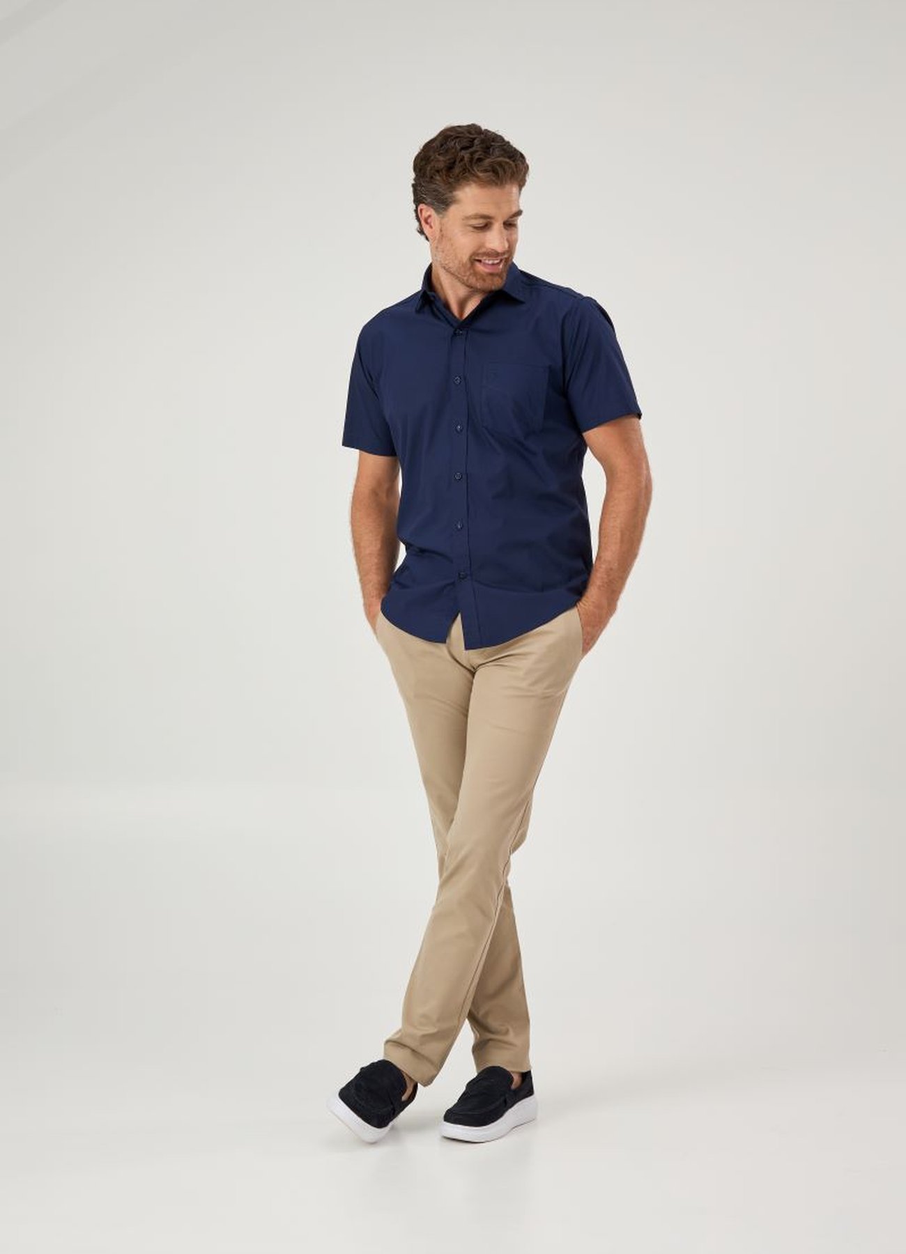 • 1 Camisa Social Masculina Manga Curta Premium Tradicional Azul Marinho com Bolso