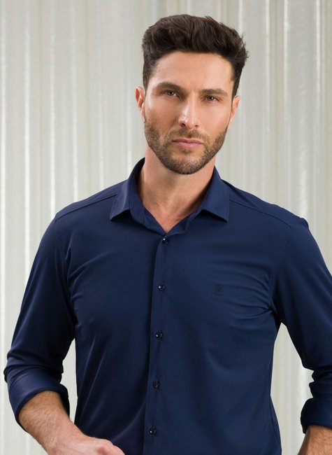 Confeccionada em tecido Ultra Stretch azul marinho, é ultra elástica, não encolhe, não amassa, não desbota e seca rápido. Flexível e resistente, dispensa passar, ideal para quem busca conforto e praticidade no dia a dia.