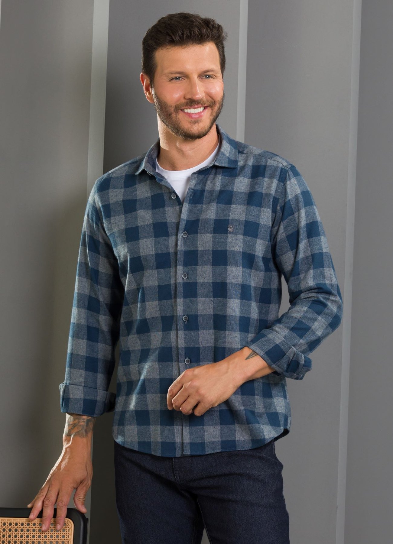 Camisa Social Masculina Manga Longa Elegance Slim Flanela Xadrez Azul e Cinza