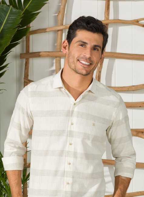 Camisa Masculina Manga Longa Elegance Slim Linho Listrada Bege