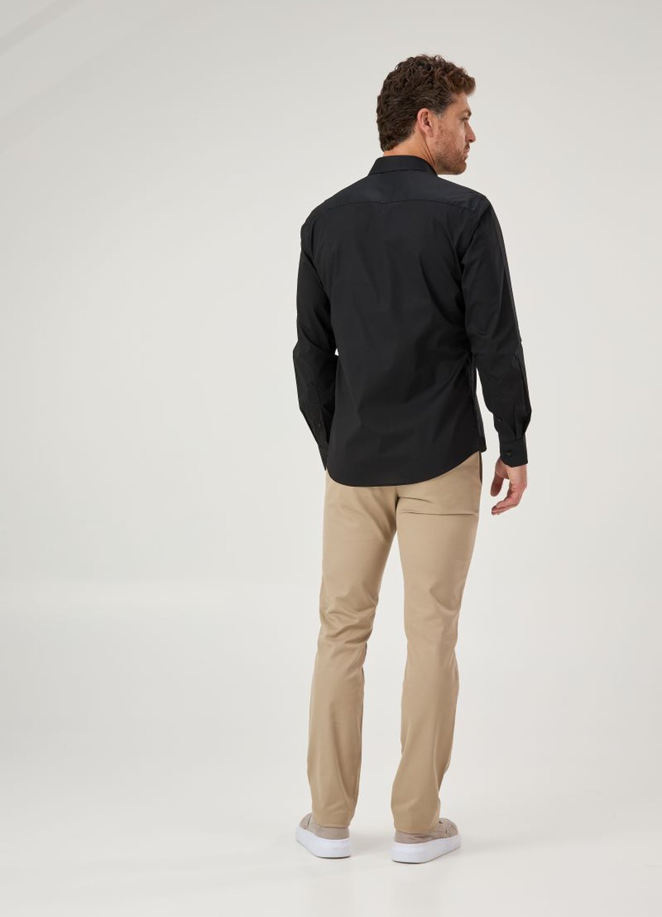 Produzida em algodão com elastano, oferece toque suave, elasticidade e conforto prolongado, mantendo o caimento ajustado e elegante da modelagem slim. O tecido proporciona respirabilidade e liberdade de movimento, garantindo aparência impecável ao longo do dia.