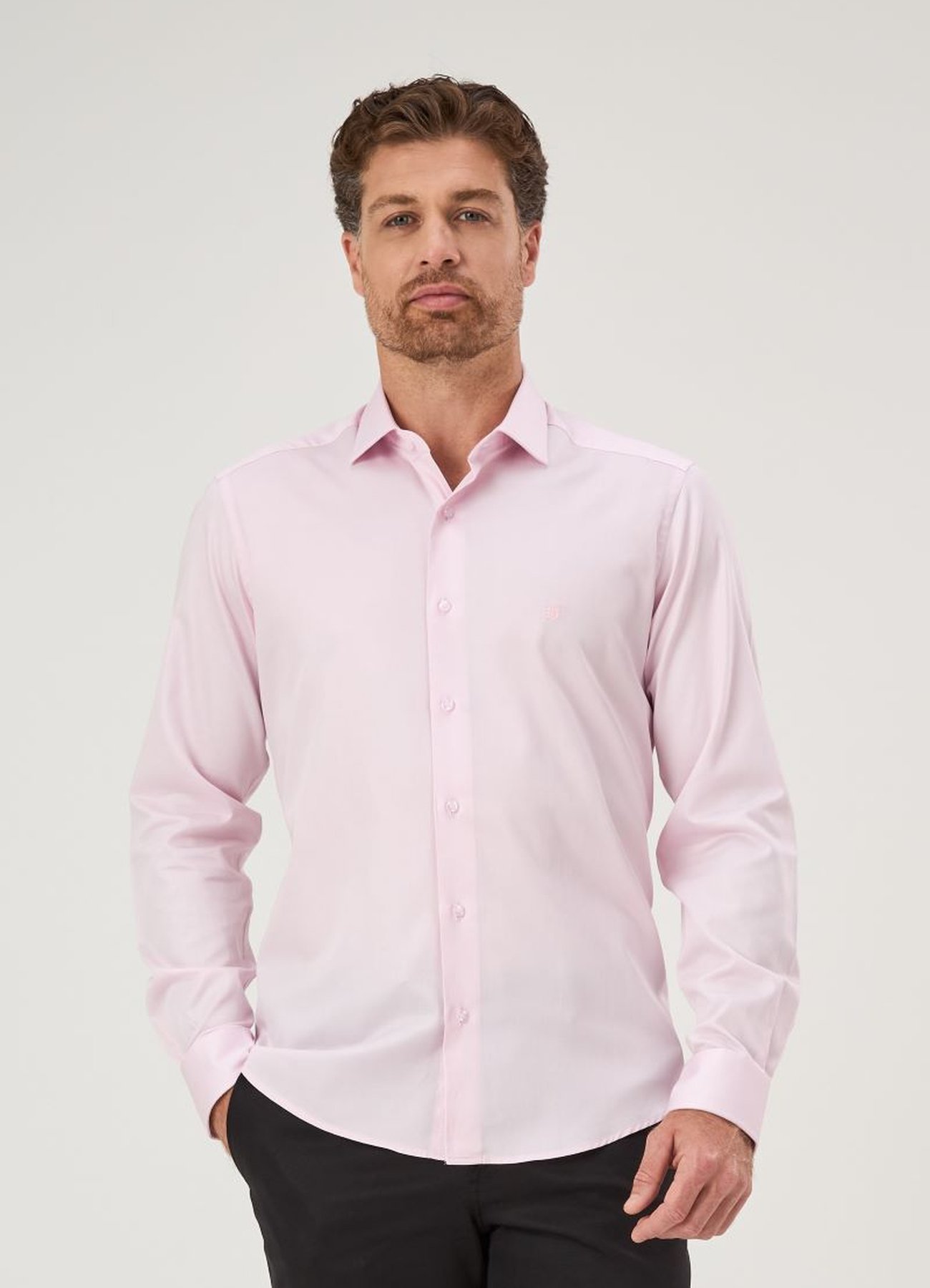 • 1 Camisa Social Masculina Manga Longa Elegance Slim Algodão Pima Rosa Claro