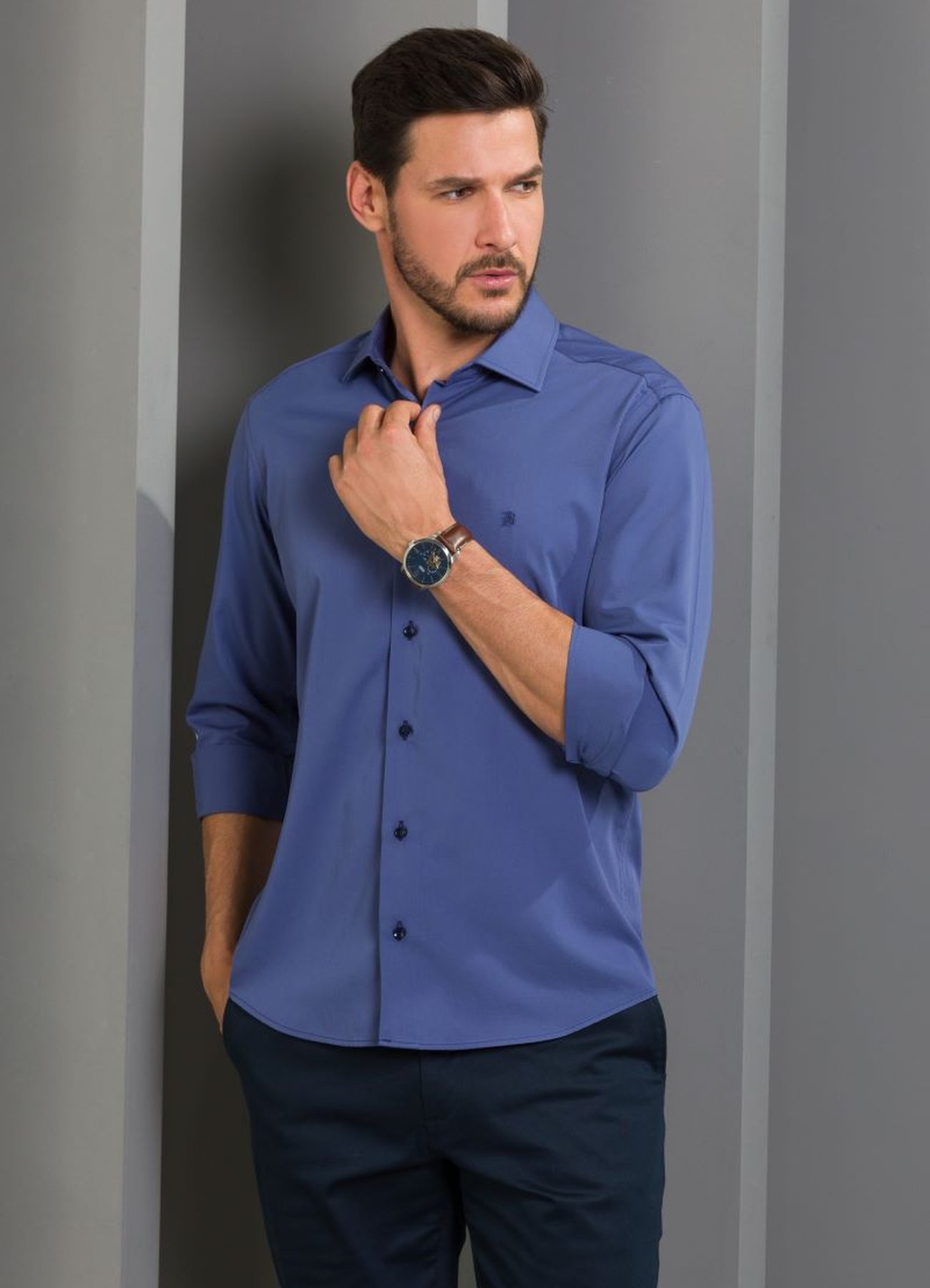 A Camisa Masculina Manga Longa Elegance Slim Azul Cobalto une elegância e conforto com modelagem slim e gola entretelada que mantém a forma. Conta com punhos ajustáveis, carcela sofisticada e abotoamento frontal total para um visual impecável.