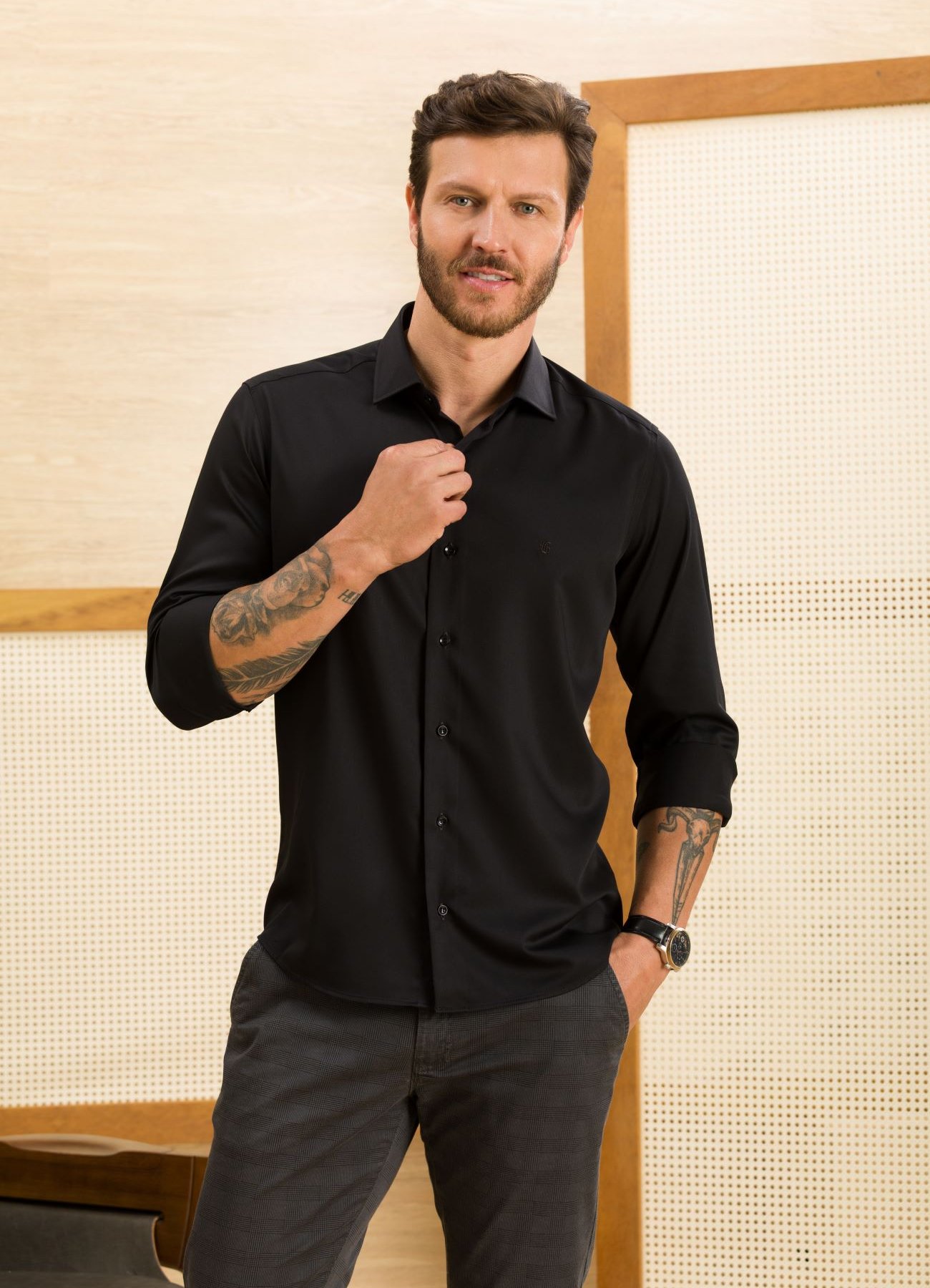 Além disso, o tecido possui baixa memória para vincos, não amassa facilmente e tem encolhimento zero, mantendo o visual sempre alinhado e prático. O tom preto clássico e elegante é perfeito para compor looks que transitam com facilidade entre o casual e o formal.