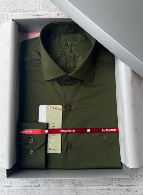 A camisa conta com abotoamento frontal total, pala traseira para acabamento refinado, além de pala interna bordada e o tradicional bordado da marca no lado esquerdo frontal, reforçando o padrão de qualidade Baumgarten.