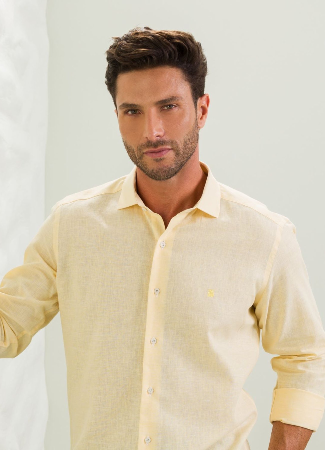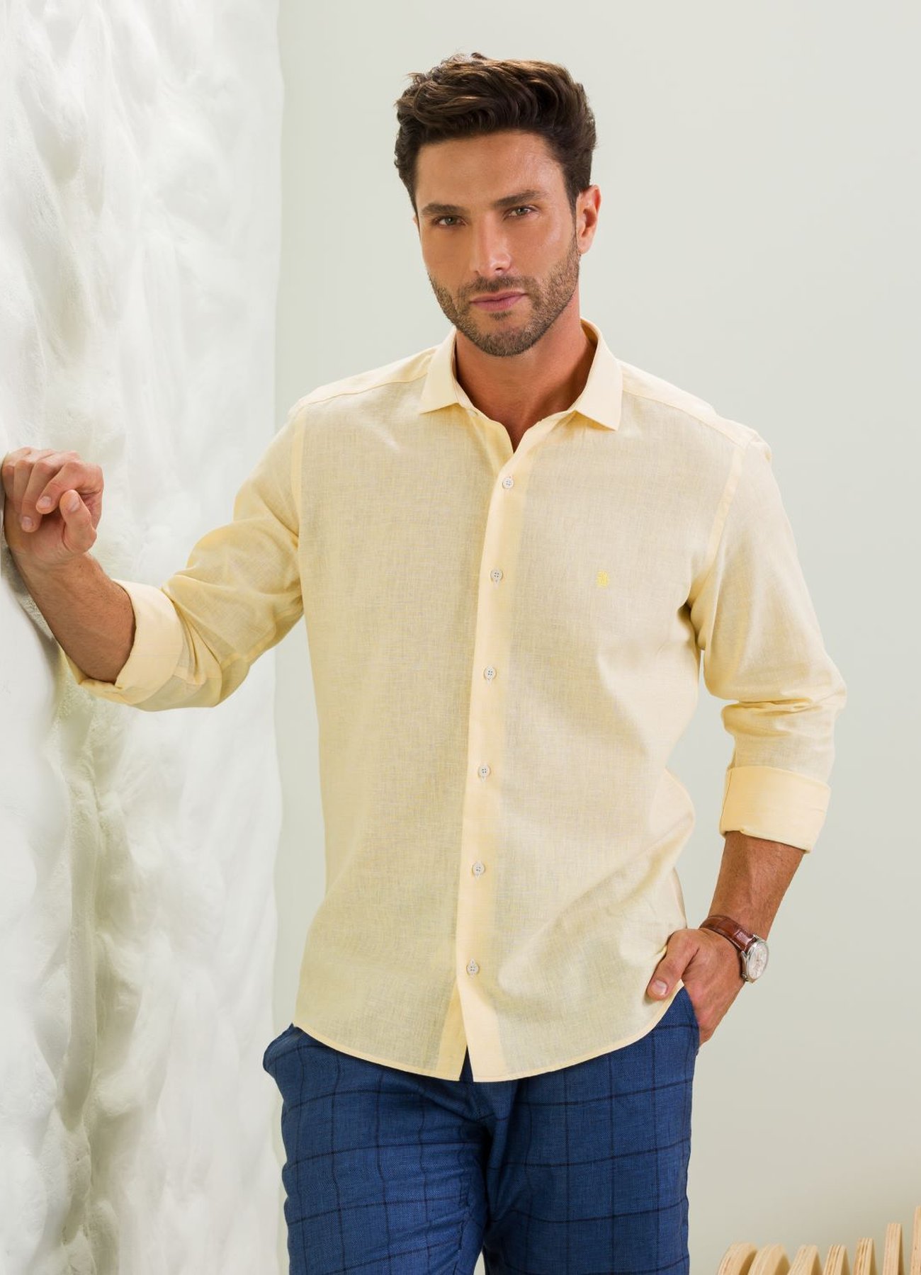 Camisa Social Masculina Manga Longa Elegance Slim Slub Amarela
