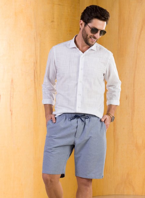 Camisa Masculina Manga Longa Elegance Slim Slub Branco com Riscos Azuis