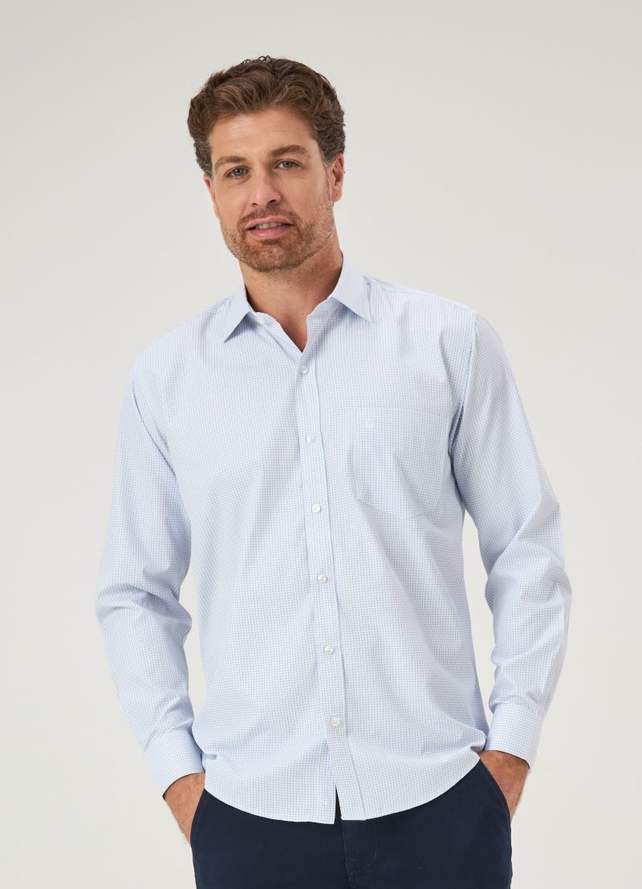 A Camisa Masculina Premium Tradicional Baumgarten em branca com xadrez azul combina sofisticação, conforto e exclusividade em uma peça atemporal de manga longa. Com modelagem tradicional (ampla), oferece caimento impecável e liberdade de movimento, perfeita para ambientes corporativos e eventos sociais.