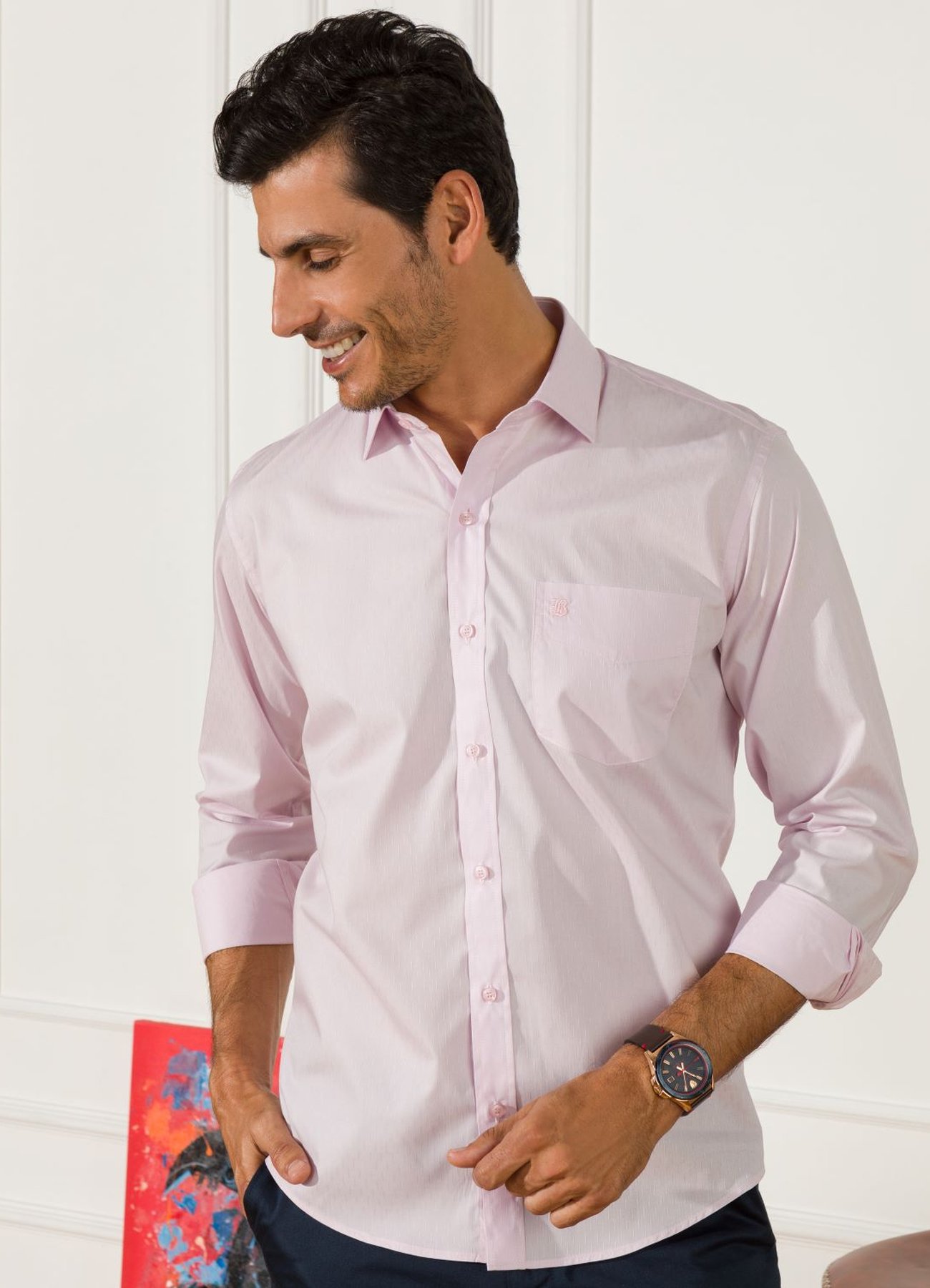 • 1 Camisa Social Masculina Manga Longa Premium Tradicional Rosa Claro com Linhas Verticais