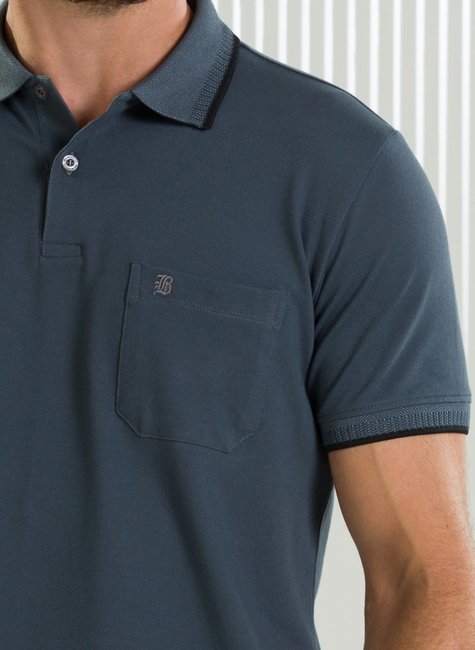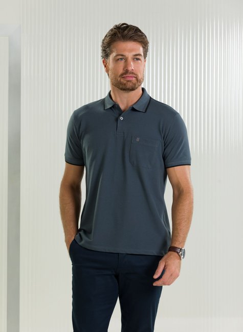 Camisa polo masculina chumbo manga curta com bolso, confeccionada em tecido piquet, que une conforto e estilo para qualquer ocasião.