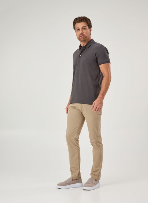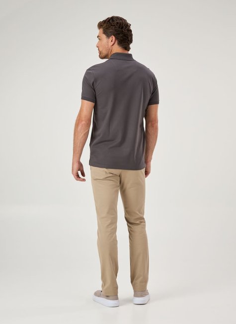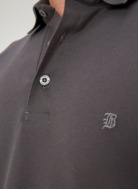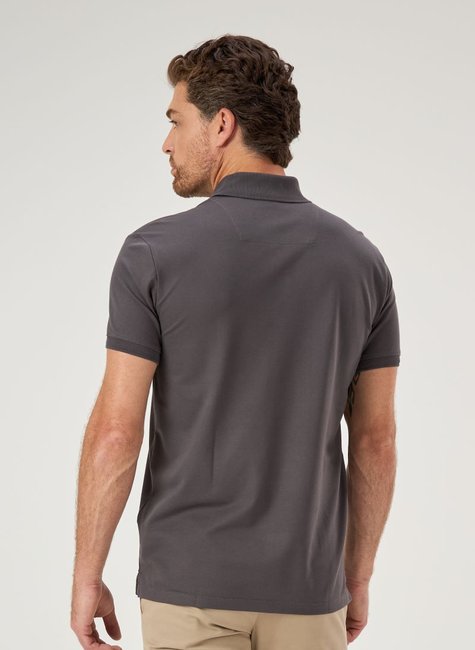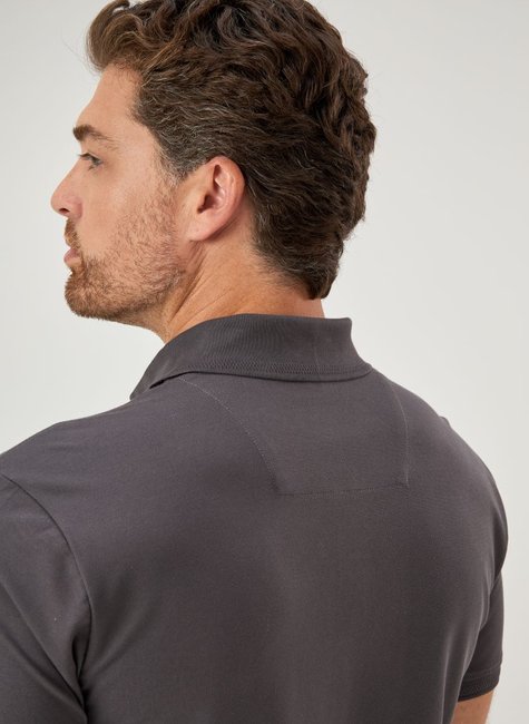 Camisa polo masculina chumbo em malha Pima, toque macio e caimento impecável. Elegância e conforto para todos os momentos.