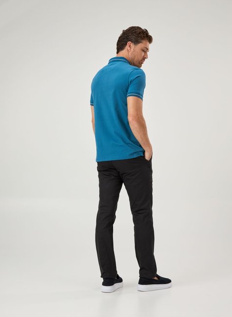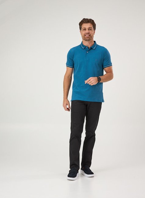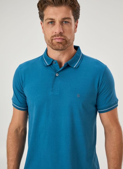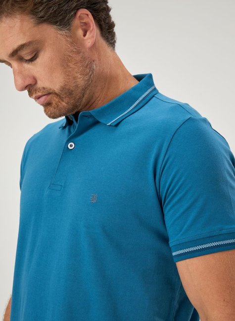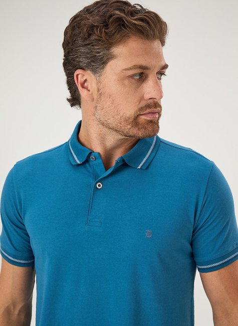 Camisa Polo masculina manga curta em meia malha azul petóleo, acabamento premium e caimento confortável. Versátil e moderna.