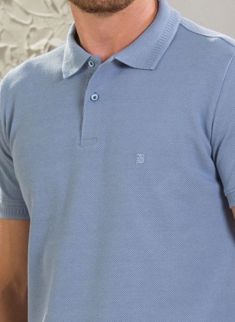 Camisa polo masculina manga curta em malha texturizada azul claro, com acabamento premium, que une conforto e estilo para diversas ocasiões..