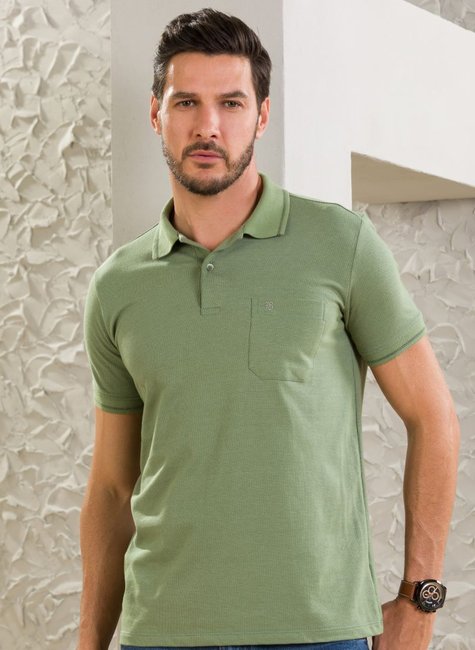 Camisa polo masculina manga curta verde com bolso frontal, feita em malha confortável e acabamento premium para uso versátil e estiloso.