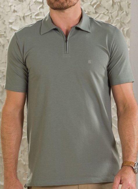 Camisa polo masculina manga curta texturizada verde musgo com zíper e acabamento D+, unindo conforto e estilo moderno em uma peça diferenciada.