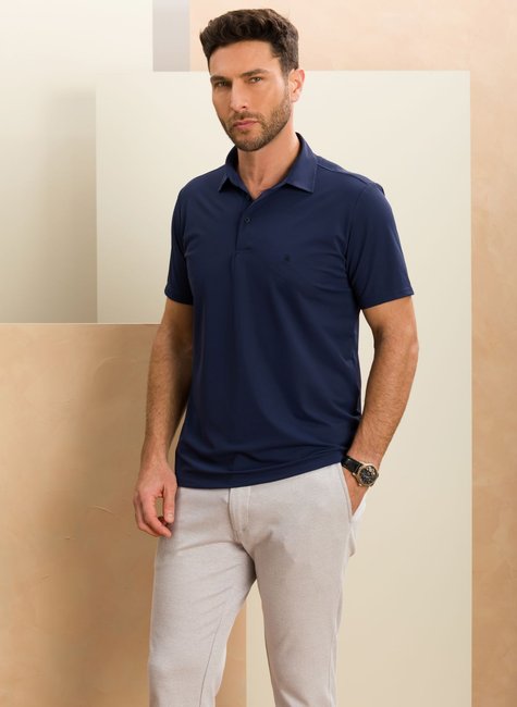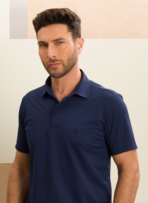 Polo masculina marinho em Ultra Stretch, flexível, leve e confortável. Não amassa, seca rápido e dispensa passar, mantendo elegância e caimento impecável o dia todo.