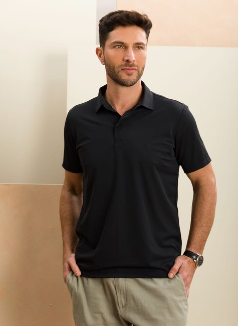 Polo masculina preta em Ultra Stretch, flexível, leve e confortável. Não amassa, seca rápido e dispensa passar, mantendo elegância e caimento impecável o dia todo.