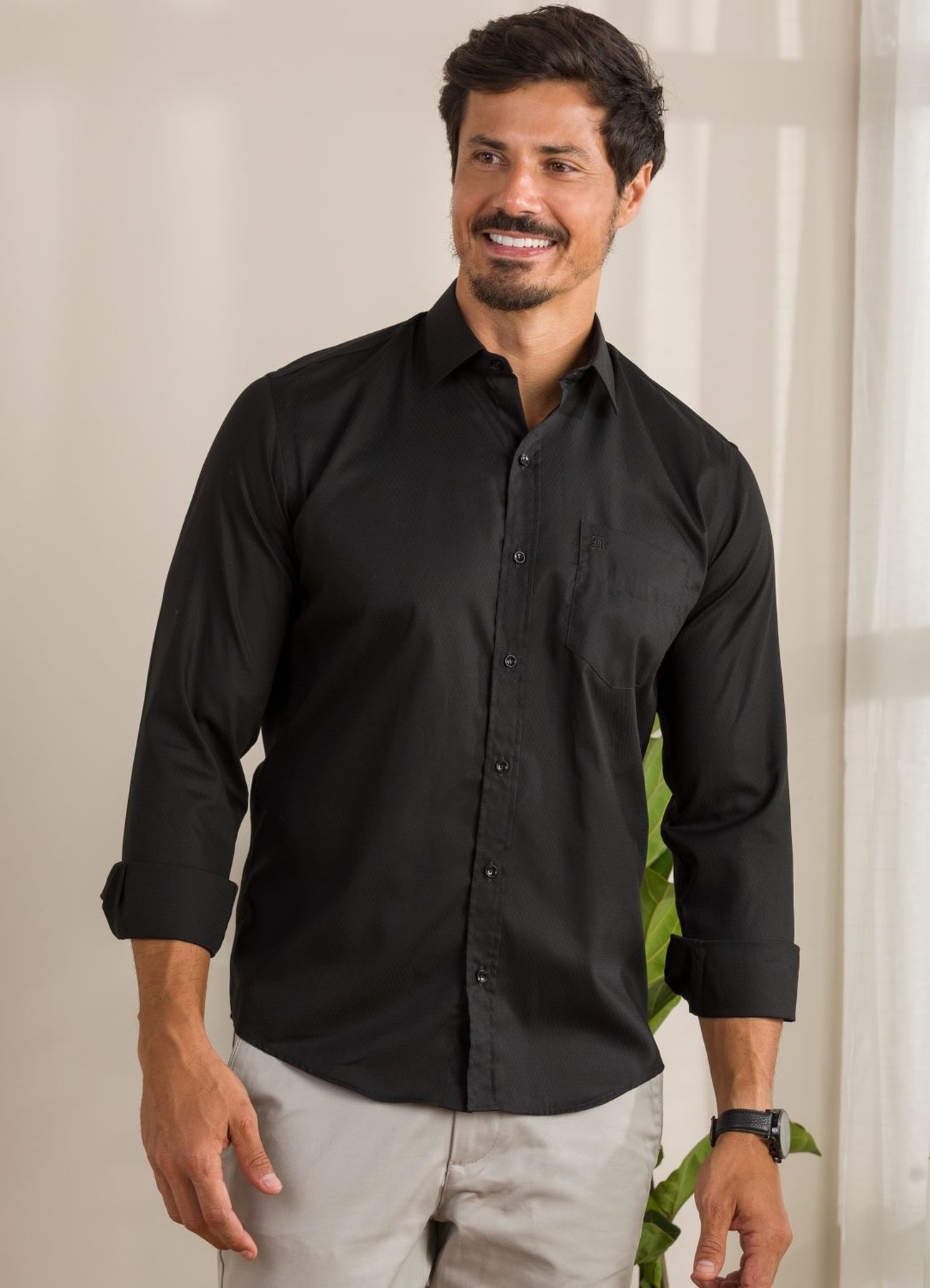 • 1 Camisa Social Masculina Manga Longa Premium Tradicional Preta com Trabalhado com Bolso