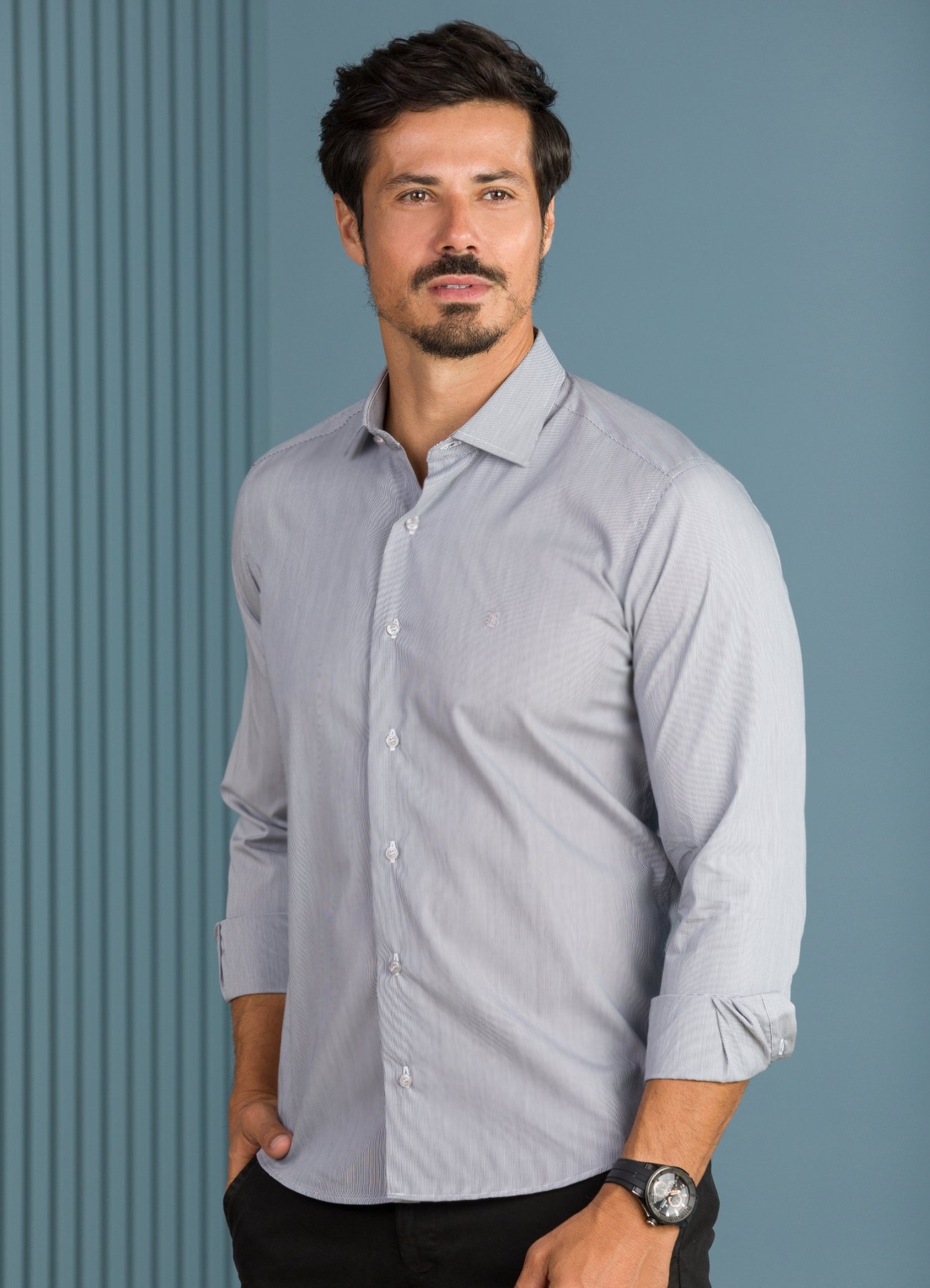 • 1 Camisa Social Masculina Manga Longa Elegance Slim Mini Listrada Preta e Branco