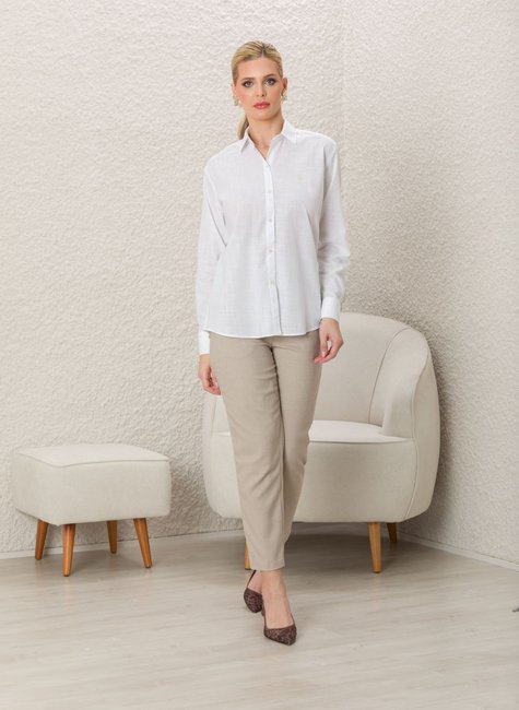A Camisa Woman Comfy Manga Longa Lisa Branca combina conforto e elegância com modelagem ampla, tecido Slub macio e acabamento sofisticado. Ideal para o dia a dia com estilo e leveza.