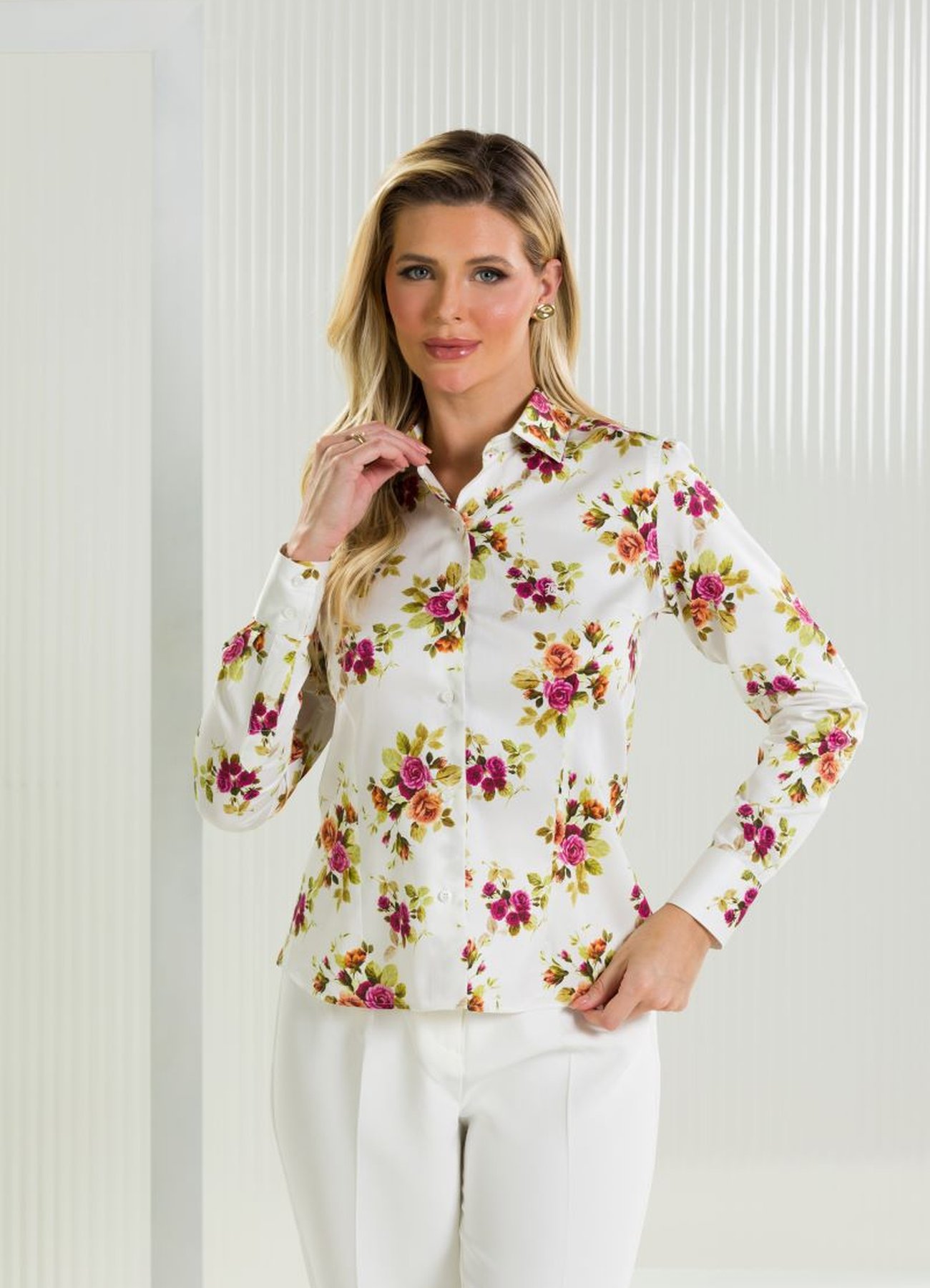 • 1 Camisa Woman Manga Longa Clássica Branca com Floral Rosa