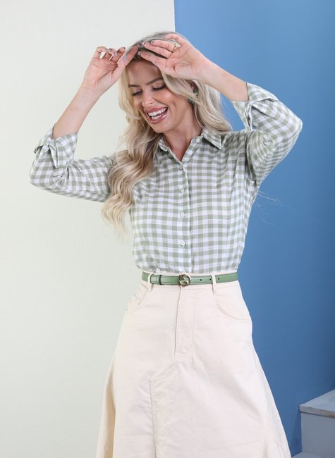 • 1 Camisa Woman Manga Longa Clássica Xadrez Verde com Branco