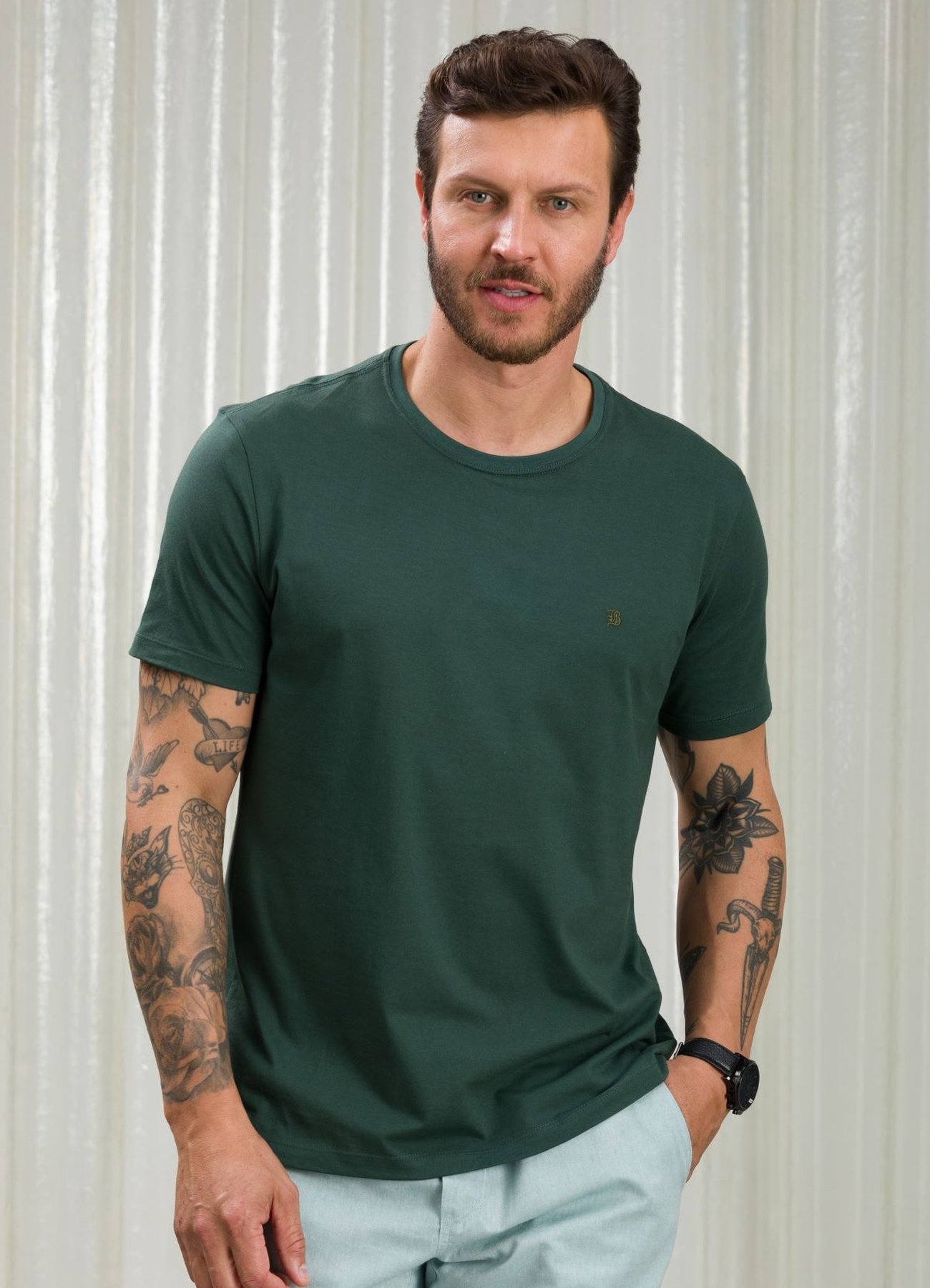 Camiseta masculina verde confeccionada em 100% algodão Pima, uma fibra nobre e premium com toque macio e brilho natural. Destaca-se pela alta durabilidade, mantendo forma e cor mesmo após várias lavagens. Conforto e sofisticação em uma peça essencial.