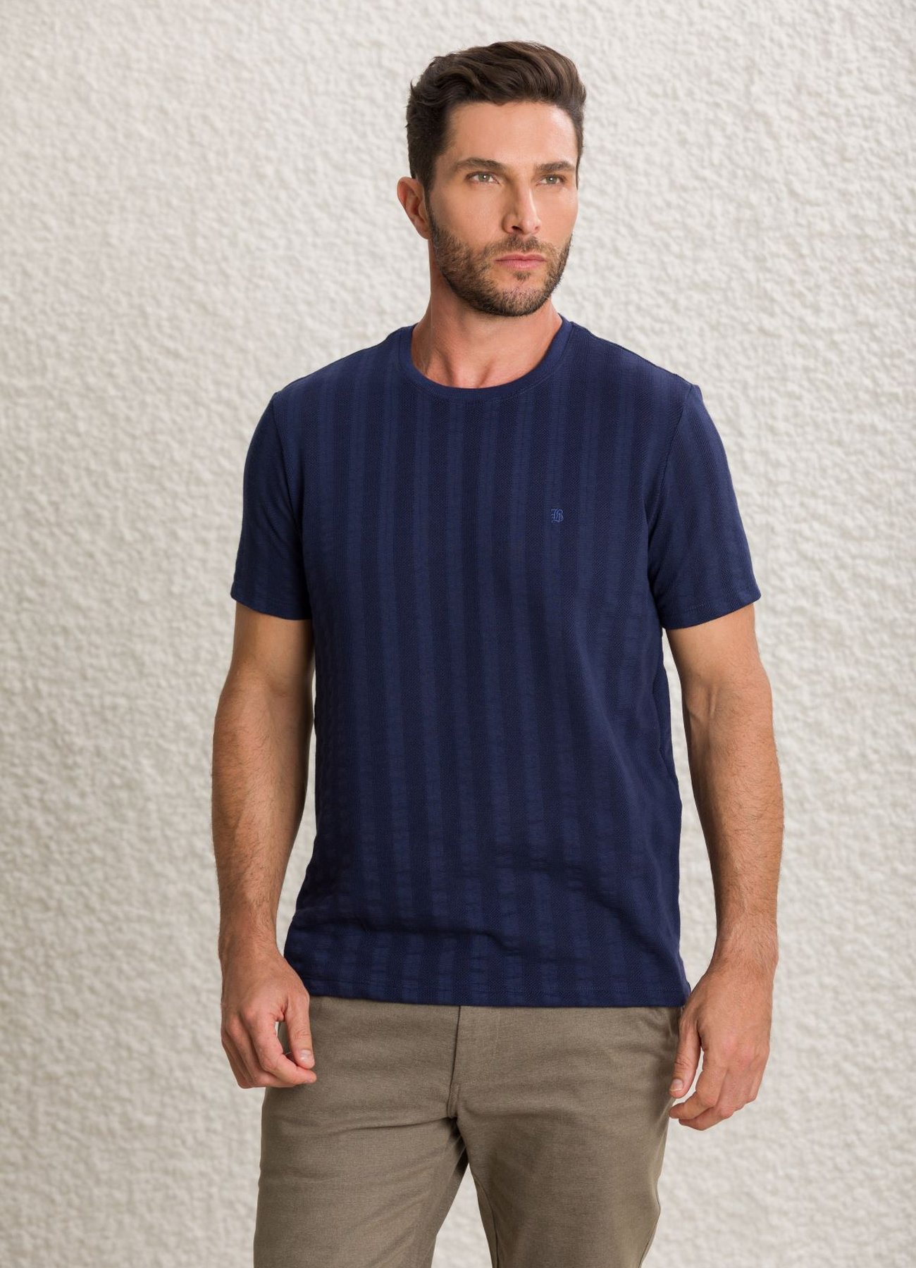 Camiseta masculina slim em malha texturizada azul marinho, manga curta e gola reforçada. Moderna, versátil e confortável.