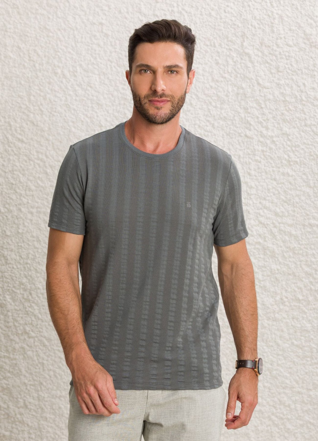 Com modelagem slim moderada, esta camiseta masculina garante caimento ajustado que valoriza a silhueta sem limitar os movimentos. Confeccionada em malha texturizada na cor chumbo, oferece toque suave e visual moderno, ideal para quem busca elegância em peças casuais.
