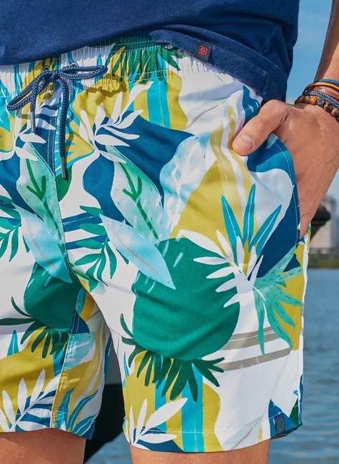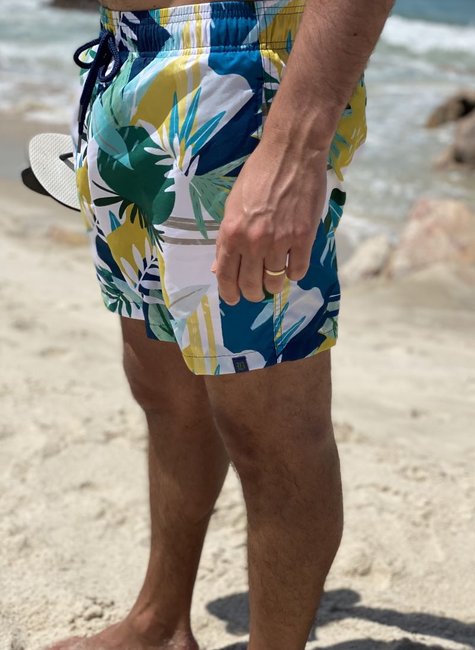 • 1 Shorts de Banho Masculino Branco Estampado Cores Amarelo, Verde e Azul