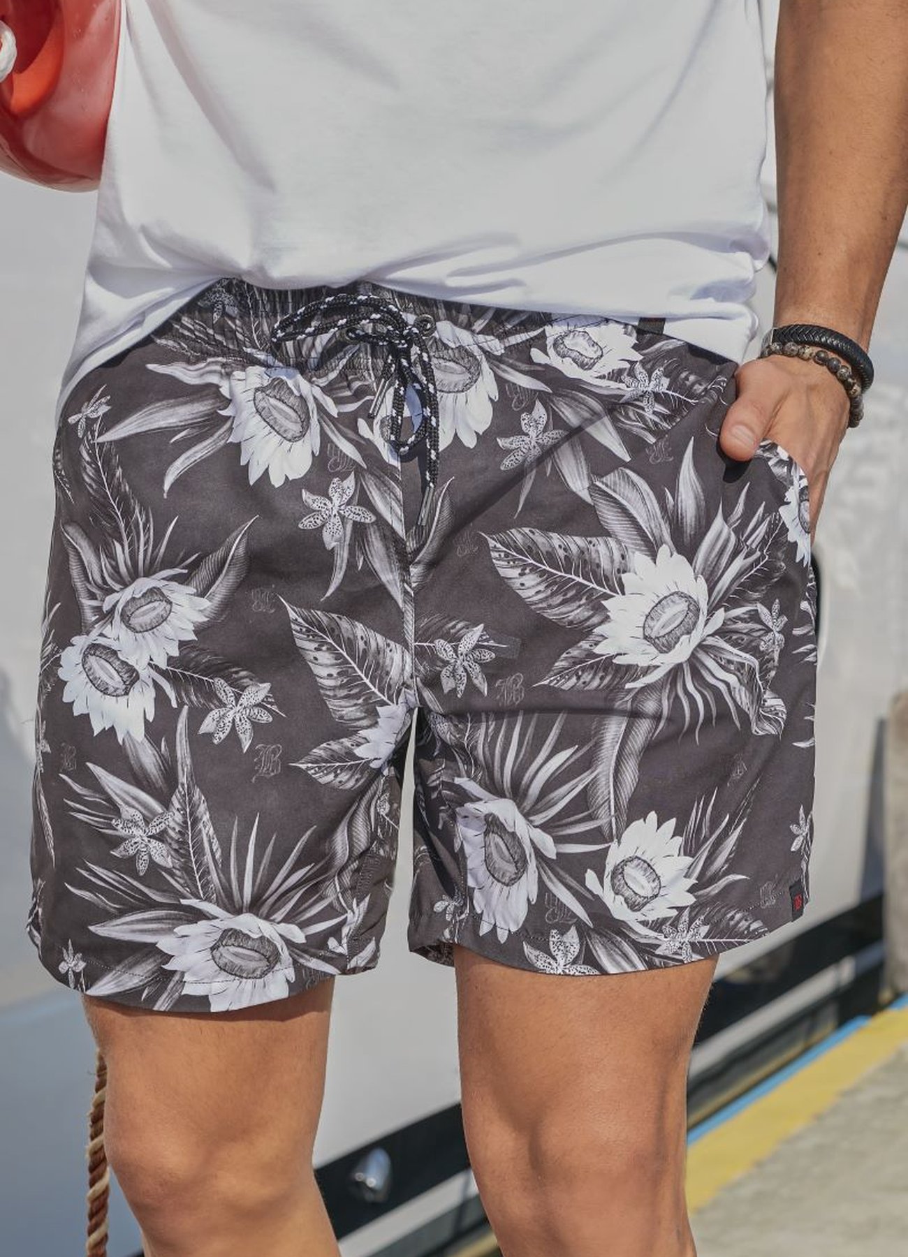 • 1 Shorts de Banho Masculino Estampado Florido Preto e Branco