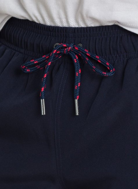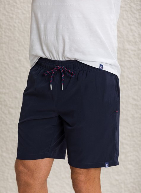 Shorts de banho masculino marinho em tecido leve, com secagem rápida, elástico ajustável, cordão com ponteiras de alumínio, bolsos funcionais e detalhe anti-areia e água.